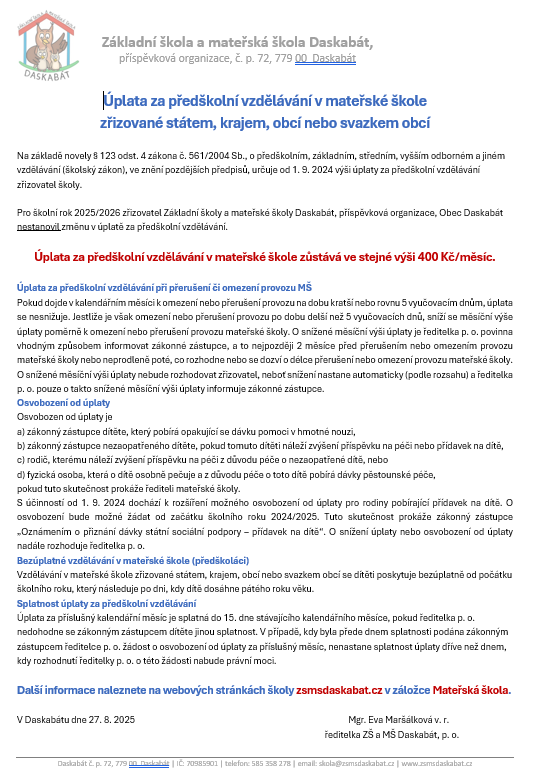 Od 1. 9. 2024 stanovil zřizovatel Základní školy a mateřské školy Daskabát, příspěvková organizace - Obec Daskabát školné v mateřské škole ve výši 400 Kč.